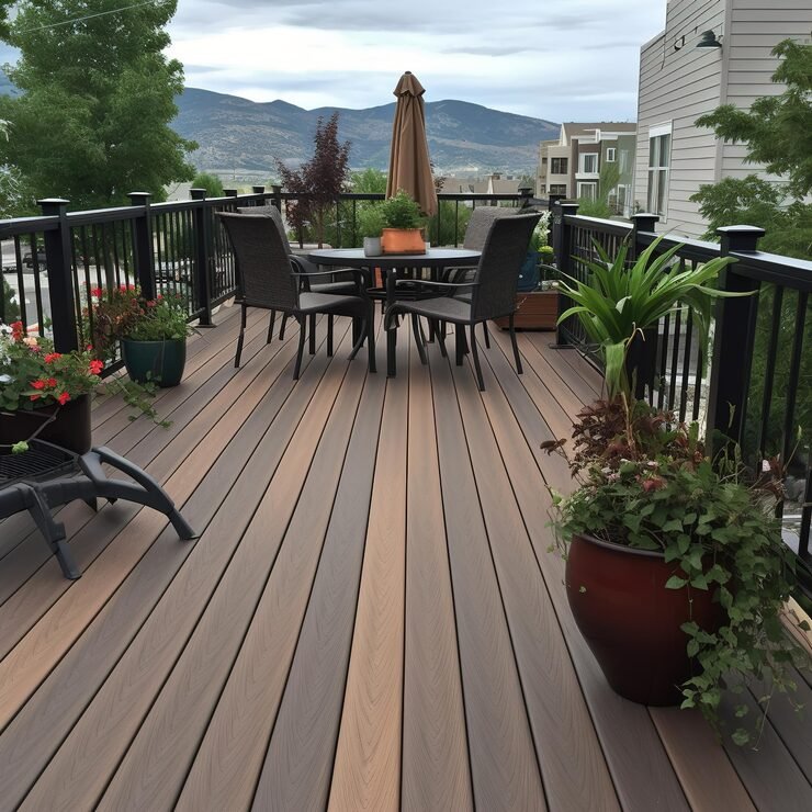 Strong decking flooring made to withstand outdoor conditions with a sleek appearance.